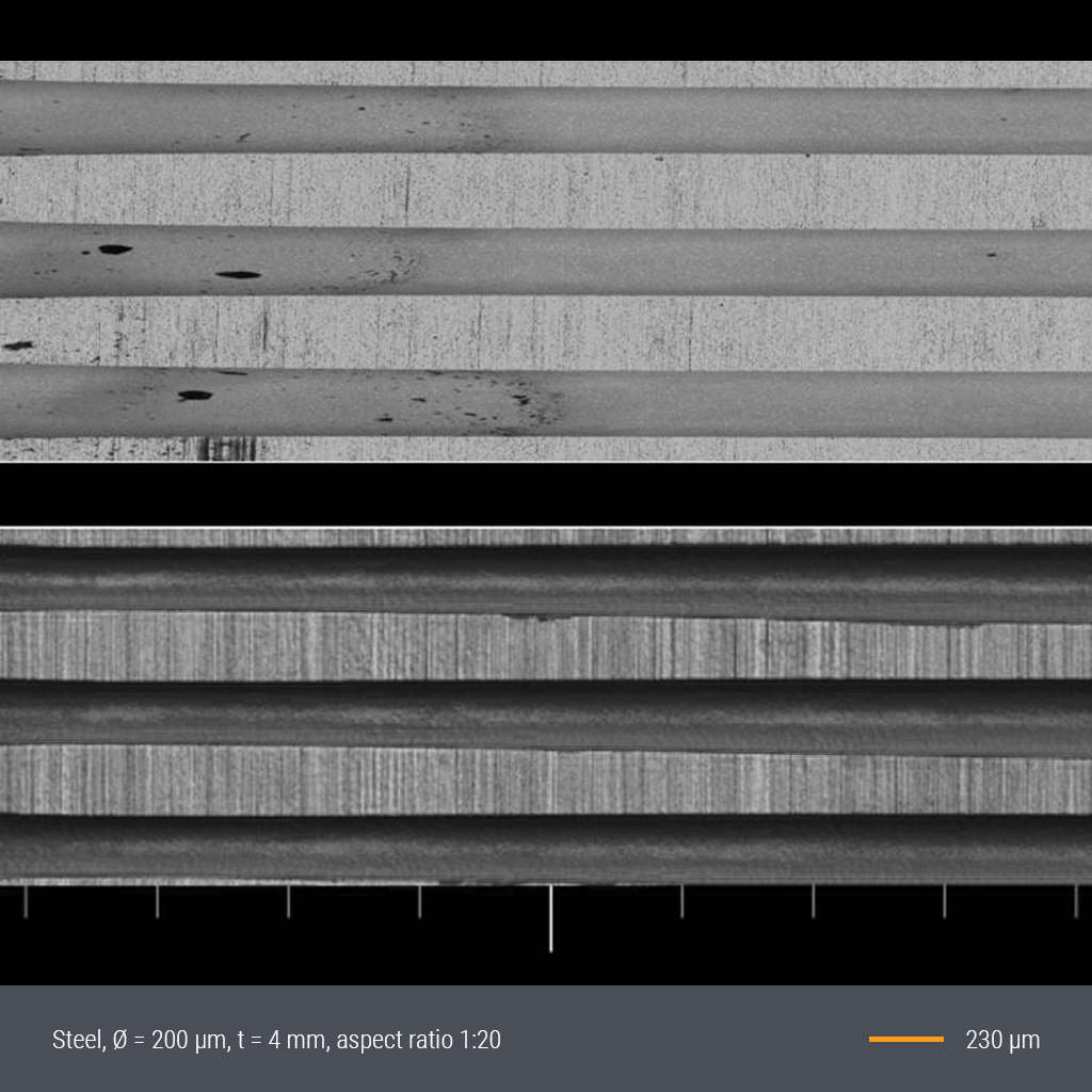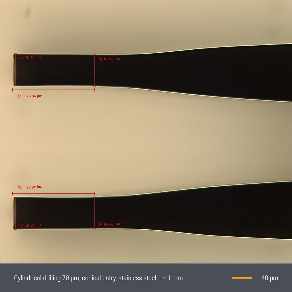 该技术兼具高精度与高适应性:一方面可加工深径比达1:15的微孔(特殊应用可达1:40),另一方面在薄板、箔材等工件上实现近乎无毛刺的高速钻孔,最高可达每分钟数千孔加工效率(如穿孔筛网应用)。我们将根据具体场景和客户需求,进行工艺选型与参数优化。